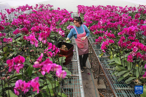 12月23日,在江蘇省連云港市農(nóng)商控股集團(tuán)農(nóng)業(yè)科技公司花卉大棚,工作人員對(duì)蝴蝶蘭進(jìn)行組盆。(新華社發(fā) 耿玉和 攝)