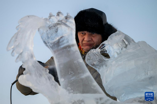 1月3日,參賽選手在哈爾濱冰雪大世界園區(qū)內(nèi)進行冰雕創(chuàng)作。(新華社記者 張濤 攝)