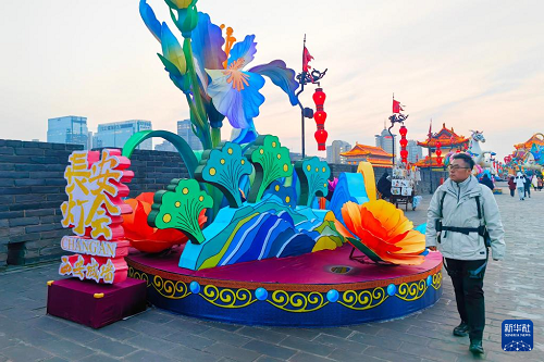 2026年1月4日,趙彬在西安城墻新年燈會期間帶著城墻外骨骼機器人巡查。新華社發(fā)