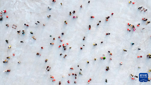 1月17日,市民在銀川文旅集團(tuán)覽山公園體驗“冰浮小龍蝦”特色項目(無人機(jī)照片)。(新華社記者 王鵬 攝)