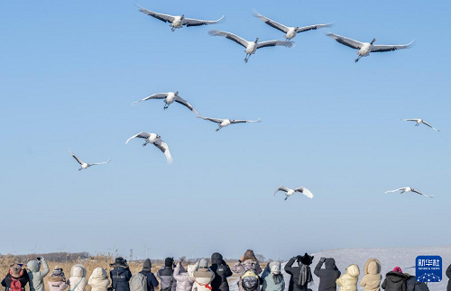 時(shí)值深冬,位于黑龍江省齊齊哈爾市的黑龍江扎龍國(guó)家級(jí)自然保護(hù)區(qū)銀裝素裹,冰雪中起舞飛翔的丹頂鶴吸引游客前來(lái)參觀、拍照。
