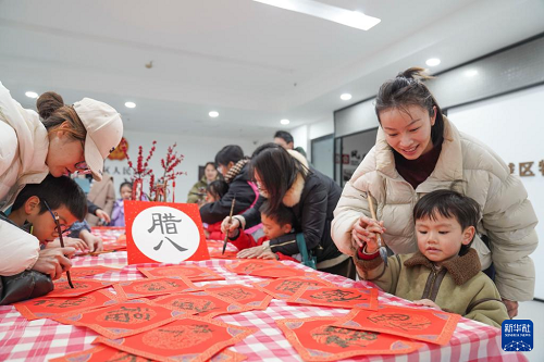1月25日,在浙江省溫州市鹿城區(qū)大南街道雙蓮橋社區(qū),孩子與家長參加臘八節(jié)傳統(tǒng)文化主題活動(dòng)。(新華社發(fā) 蘇巧將 攝)