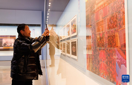 1月26日,在中國非物質(zhì)文化遺產(chǎn)館舉行的展覽現(xiàn)場,觀眾用手機拍攝展覽作品。(新華社記者 金立旺 攝)