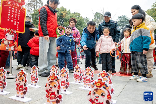2月4日,在浙江省湖州市長興縣雉城街道古城公園,社區(qū)居民參與“馬年套圈圈福氣”趣味體驗活動。(新華社發(fā) 譚云俸 攝)