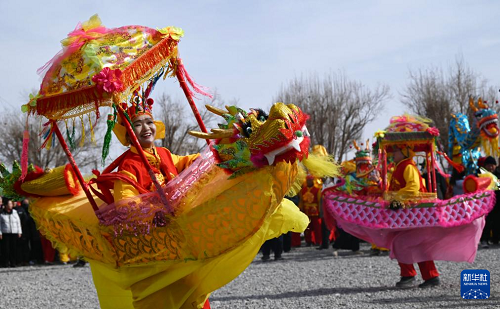 2月4日,人們在甘肅省敦煌市白馬塔景區(qū)“打春?!薄#ㄐ氯A社發(fā) 張曉亮 攝)