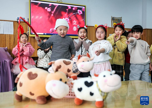 2月4日,在河南省焦作市博愛縣縣直幼兒園,小朋友做“打春?!庇螒颉#ㄐ氯A社發(fā) 程全 攝)