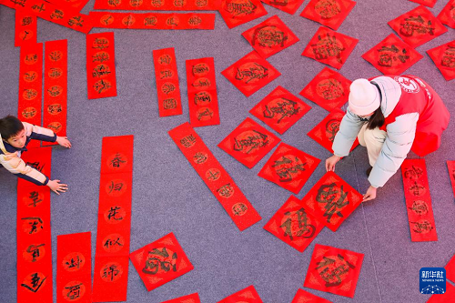 2月8日,學(xué)生志愿者(右)在江蘇省海安市政協(xié)書畫聯(lián)誼會送福字、贈春聯(lián)文化惠民活動現(xiàn)場整理書法作品。(新華社發(fā) 顧彬斌 攝)