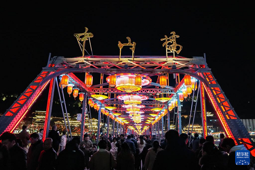 這是2月10日在蘭州市城關(guān)區(qū)拍攝的蘭州黃河鐵橋中山橋新春燈飾。(新華社記者 郎兵兵 攝)
