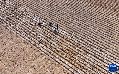 2月13日,在山東省棗莊市山亭區(qū)桑村鎮(zhèn),農(nóng)民在播種馬鈴薯(無人機照片)。(新華社發(fā) 李宗憲 攝)