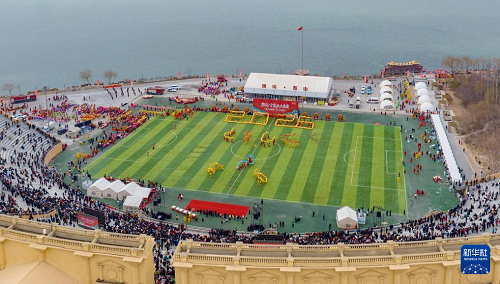 3月1日,在寧夏銀川市覽山公園,參賽社火隊(duì)的演員在比賽中(無人機(jī)照片)。(新華社記者 楊植森 攝)