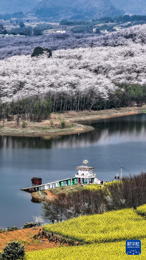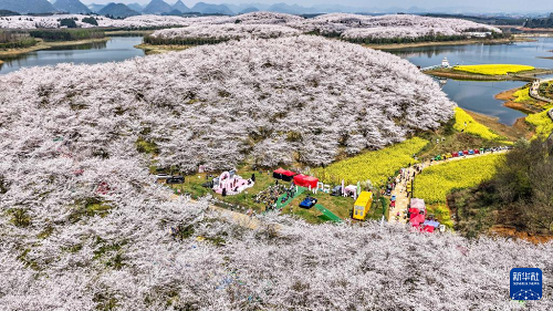 近日,隨著氣溫回升,貴州省貴安新區(qū)櫻花園內(nèi)的2.4萬畝櫻花迎來盛花期。如云似霞的櫻花和山川、湖泊、民居構(gòu)成一幅幅美麗的春日畫卷,吸引眾多游客前來觀光游玩。