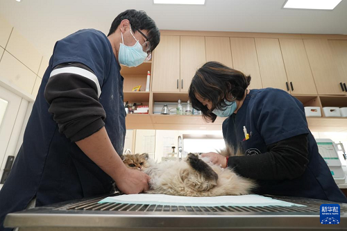 2月3日,在無(wú)錫關(guān)愛(ài)寵物醫(yī)院,醫(yī)護(hù)人員給寵物貓?zhí)昝#ㄐ氯A社發(fā) 劉臻睿 攝)