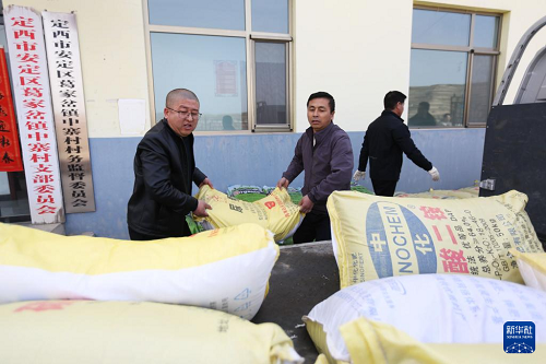 3月24日,甘肅省定西市安定區(qū)城市管理局駐村幫扶工作隊(duì)的工作人員在葛家岔鎮(zhèn)中寨村幫助村民裝運(yùn)農(nóng)資。(新華社發(fā) 王克賢 攝)