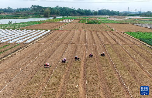3月24日,廣西南寧市邕寧區(qū)蒲廟鎮(zhèn)農(nóng)民在田園里種植蔬菜(無(wú)人機(jī)照片)。(新華社發(fā) 方永濤 攝)
