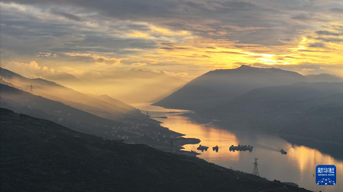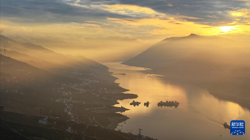 傍晚時(shí)分,落日余暉下的長江重慶奉節(jié)段秀美如畫,別有一番風(fēng)味(3月24日攝,無人機(jī)照片)。(新華社記者 王全超 攝)