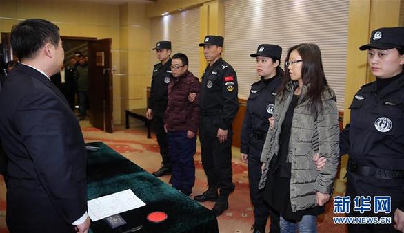 2月6日,在北京首都機(jī)場,檢察官向“百名紅通”嫌犯付耀波(右五)、張清曌(右二)宣讀相關(guān)法律文書。當(dāng)日,在中央追逃辦統(tǒng)一部署下,在外交部、公安部及我駐巴巴多斯、格林納達(dá)等駐外使館的大力協(xié)助下,遼寧省追逃辦組織協(xié)調(diào)檢察、公安等部門,成功將遠(yuǎn)逃至加勒比海島國圣文森特和格林納丁斯的“百名紅通”第39號嫌犯付耀波、第41號嫌犯張清曌同時抓獲歸案。新華社記者殷剛攝
