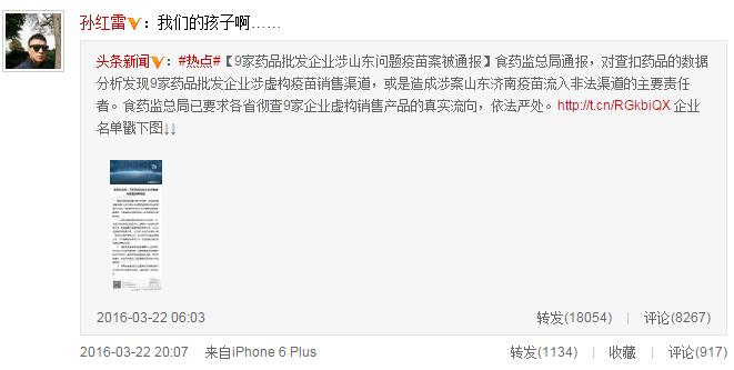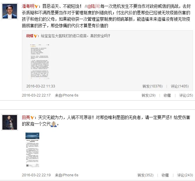 繼章子怡、賈乃亮等人在微博發(fā)聲關(guān)注疫苗安全問題后,3月22日晚,孫紅雷也在微博心痛呼叫“我的孩子……”任賢齊在微博中寫道:“請(qǐng)重視并嚴(yán)懲無良商人!別讓這些混蛋荼毒孩子們的健康!”舒淇、趙薇也排隊(duì)轉(zhuǎn)發(fā)并利用自身名人效應(yīng)呼吁。