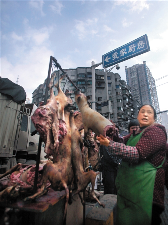 在貴陽(yáng)市新路口菜市場(chǎng)上宰殺生狗、火燒狗皮,販賣狗肉的攤販一家接著一家