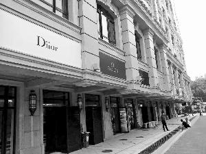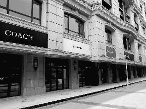 昨日,北京晨報(bào)記者來到位于建國門橋附近的中海楓丹公館,看到整個(gè)樓盤有五棟樓,呈凹字形。建筑物四周設(shè)有30多個(gè)大小不一的底商,每個(gè)底商頂部都掛著一個(gè)看似國際大牌的招牌,既有奢侈品,也有快餐業(yè),顏色鮮艷,十分奪目。就在這些大牌的招牌旁邊,張貼著大幅廣告“黃金旺鋪火爆招商中”。