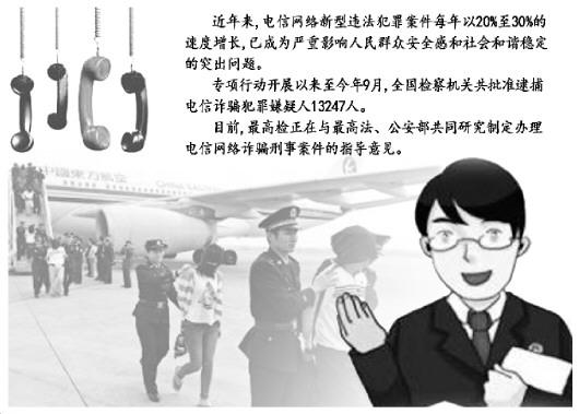 《法制日報(bào)》記者從最高人民檢察院與公安部近日聯(lián)合召開的電信網(wǎng)絡(luò)新型違法犯罪重點(diǎn)整治、突出地區(qū)督導(dǎo)會上了解到,被掛牌的7個(gè)重點(diǎn)地區(qū)和5個(gè)突出地區(qū)檢察機(jī)關(guān)積極主動作為,出重拳、下重手、用重典,快速批捕起訴了一批有震動、有影響的重大電信網(wǎng)絡(luò)詐騙犯罪案件,取得了初步成效。據(jù)統(tǒng)計(jì),專項(xiàng)行動開展以來至今年9月,全國檢察機(jī)關(guān)共批準(zhǔn)逮捕電信詐騙犯罪嫌疑人13247人。
