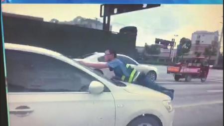 黑車司機將執(zhí)法人員頂上引擎蓋逃跑。視頻截圖