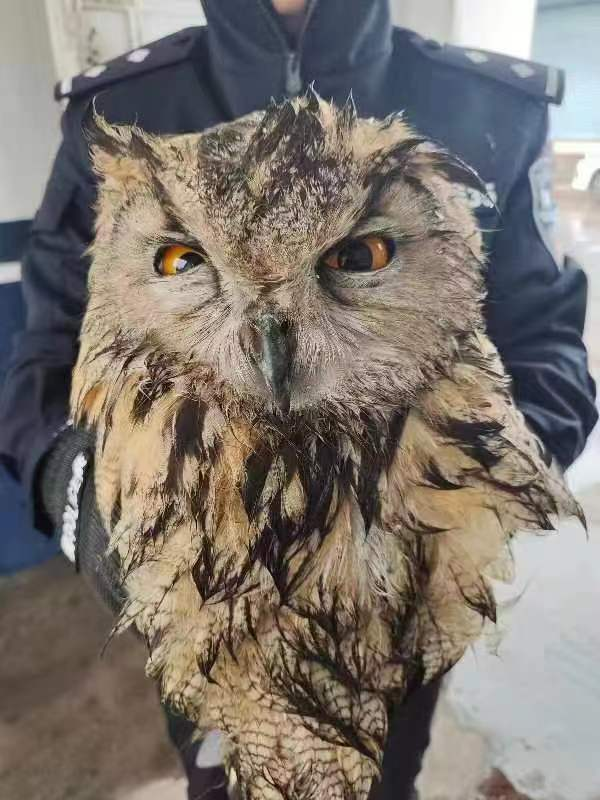 民警立即到達現(xiàn)場,仔細查看后發(fā)現(xiàn)貓頭鷹翅膀受傷,因巡鎮(zhèn)鎮(zhèn)沒有專門的野生動物救助站,于是將其送往當(dāng)?shù)孬F醫(yī)站治療。