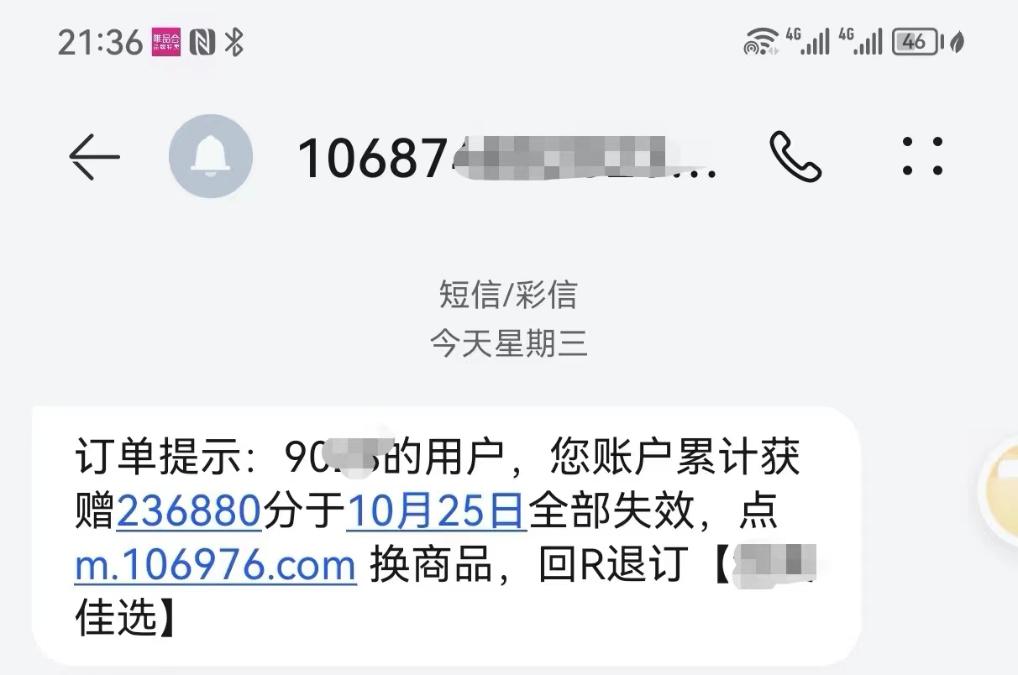 北京一位消費者日前收到的“積分兌換”短信。