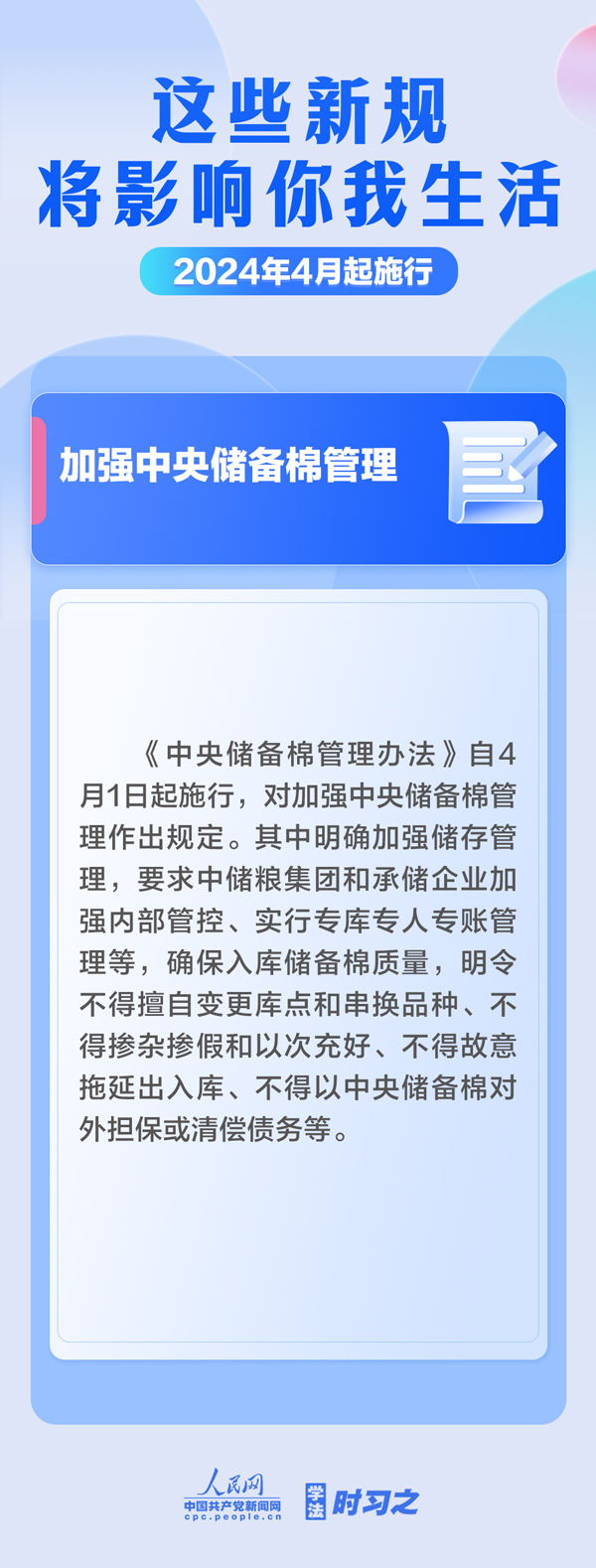 加強(qiáng)中央儲(chǔ)備棉管理;明確托育機(jī)構(gòu)質(zhì)量評(píng)估標(biāo)準(zhǔn);規(guī)范可再生能源電量收購(gòu)……4月起,這些新規(guī)施行,將影響你我生活。(薄晨棣)