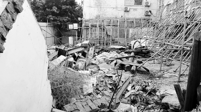 一節(jié)節(jié)鋼梁和木樁橫七豎八地堆在廢墟上,舊衣破被散落一地,已與凌亂的碎磚瓦一樣顏色,枯黃的蒿草更透著一股凄涼。幾十上百根黃色的鋼管密密匝匝地交織著,在僅有的堅(jiān)固地面落腳,努力頂住93號院南側(cè)和西側(cè)的4層白色樓體。