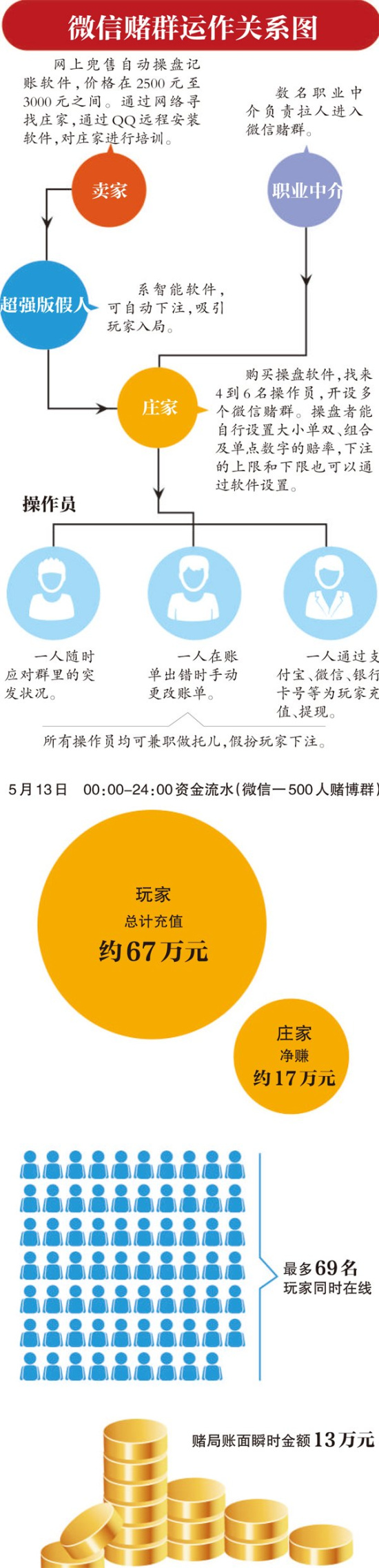 而且,微信賭博蔓延迅速、涉及面廣。玩法多樣,每個群都可以建立一套獨特的游戲規(guī)則,傳播速度呈裂變式擴散。借著“紅包接龍”的瓶子,注入“下注博彩”“抽頭賺錢”的酒,表面是“輸贏皆可能”,但博彩者往往悲哀地發(fā)現(xiàn),最終贏得盆滿缽滿的總是群主、包主、財務等組織者,輸個一絲不掛的總是自己。當圖好玩的“拼手氣”變成殺紅眼的“賭輸贏”,微信紅包原有的娛樂性蕩然無存,而變成充滿兇險的賭場。