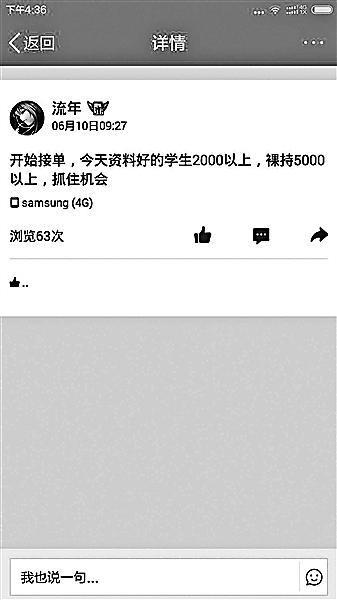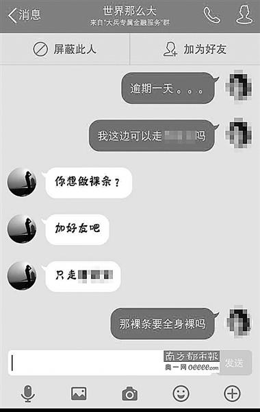 以手持身份證的裸照為抵押進行借款 可以借款的金額是普通借款額度的2至5倍 ·風險 這些借給她的人里,全都是“假熟人” “他們說還不上就把裸照發(fā)給家人、發(fā)給朋友” ·提醒 “借貸平臺未及時刪除屏蔽,應(yīng)承擔連帶責任” “如果真拿裸照抵押給出借人,從法律上來講是無效的” 據(jù)新華社、北京青年報、南方都市報 ① 活躍在借貸寶平臺的中介 ②③ 記者與自稱可提供服務(wù)的網(wǎng)貸中介的聊天記錄 ④ 借貸者在網(wǎng)上發(fā)布的裸照文件 近日,有網(wǎng)友曝光稱,通過網(wǎng)絡(luò)借貸平臺借貸寶,有女大學(xué)生被要求“裸持”(以手持身份證的裸照為抵押,也被稱為“裸條”)進行借款,逾期無法還款將被威脅公布裸照給家人朋友,且借款周利息高達30%。 13日,記者調(diào)查發(fā)現(xiàn),在一些借款群中,女大學(xué)生“裸持”借款已經(jīng)成為公開的秘密,通過“裸持”可以借款的金額是普通借款額度的2至5倍,但逾期未還將面臨裸照被公布的威脅,甚至有借款人威脅“裸持”借款的女生提供性服務(wù)。 對于上述情況,借貸寶稱,高息、“裸持”等是用戶私下的個人行為,該公司無權(quán)干涉,并表示“出借款風險需要自擔”。 有律師表示,借貸平臺作為服務(wù)提供者,對顯而易見的違法信息負有監(jiān)測排除的義務(wù),特別是經(jīng)過借貸者反映投訴的,未及時刪除、屏蔽,應(yīng)承擔連帶責任。 “一次借一周, 一周的利息是30%” 12日晚,記者聯(lián)系上一位“裸持”的借款人林曉(化名),這個來自江蘇的女大學(xué)生現(xiàn)在正被債主威脅公布她的裸照。 林曉說,今年2月,因為創(chuàng)業(yè)開網(wǎng)店需要進貨,她通過“借貸寶”向平臺上的“熟人”借了500元錢?!耙淮谓枰恢?,一周的利息是30%,還的時候要還650元?!币恢芎?,因為“逾期”還不上這些錢,林曉又在平臺上發(fā)布借款標,向其他“熟人”借錢還上第一筆借款。 所謂“熟人”是使用借貸寶的成員間的核心關(guān)系,一個人想通過借貸寶借到錢,只能向其添加為“熟人”的聯(lián)系人借錢,而其他用戶則看不到此人的借款信息。借貸寶平臺方默認“熟人”之間是相互熟識的,所以平臺不承擔借貸風險,而由借款人和出借人雙方自擔。 但是這里的“熟人”卻往往不是真正的熟人。林曉稱,在平臺之外,一些需要借款的學(xué)生和出借人都在幾個QQ群里,想借多少錢、什么時候還,這些條件談好后在借貸寶上互相添加好友,而這些人其實互相根本就不認識。 索要家庭地址 和家人聯(lián)系方式 這種“假熟人”的借貸關(guān)系往往伴隨著高利貸。 林曉借的錢越來越多,30%的利息下,很快500、1000的小額貸款就滿足不了林曉拆東墻補西墻的需求了?!斑@時候就看到群里有中介說,女大學(xué)生可以‘裸持’借款,即使有‘負債’也沒關(guān)系,發(fā)送裸照給老板就能借到更多錢?!?/p> 林曉回憶,通過中介,她聯(lián)系了一位出借人,對方要求林曉發(fā)送自己的生活照、姓名、身份證、家庭地址和家人聯(lián)系方式,以及幾名同學(xué)的聯(lián)系方式,并索要了林曉手持身份證的幾張裸照和視頻,核實信息后借出了5000元給她。 即便“裸持”,能借到的也依然是周利率30%的高利貸,毫無懸念,林曉最后根本還不起。 “裸持”借款逾期后,林曉曾遭到借貸寶平臺的催款,此時,出借人也開始威脅她?!八麄兙屯{說還不上就把裸照發(fā)給家人、發(fā)給朋友。” 高利貸越滾越大,林曉通過借貸寶平臺總共向15人先后借款12萬余元,但只短短4個月時間,債務(wù)就已經(jīng)滾到了25萬余元。這些借給林曉錢的人里,沒有一個是她真正認識的人,全都是“假熟人”,林曉根本就不知道這些人的真實身份。 越滾越大的債務(wù)還不是最致命的,林曉的裸照捏在3個人手里,只要林曉不能按期還錢,他們就威脅將林曉的裸照公布到網(wǎng)上,并發(fā)給她的家人和朋友。林曉被逼得沒有辦法,最終只得將此事告知家人,在家人的幫助下,慢慢還高息貸款,“但到現(xiàn)在還有將近6萬元沒還上”。 調(diào)查 強調(diào)需要“露臉” “資質(zhì)好可以1萬元” 新華社記者調(diào)查發(fā)現(xiàn),名目繁多的校園網(wǎng)絡(luò)貸款方式日漸風靡,一些具有高利貸性質(zhì)的借貸平臺令不少學(xué)生陷入困局。 “第三方校園借貸平臺大多是高利貸平臺。”河南豫龍律師事務(wù)所律師付建認為,一些第三方校園借貸平臺利用學(xué)生金融知識匱乏以及虛榮心態(tài),鉆監(jiān)管的空子,打法律擦邊球謀取暴利。 13日,記者以學(xué)生身份加入幾個借款群,詢問是否可以借錢后,幾名“中介”添加記者為好友。中介稱:如果多借都是裸持,不然就一次1000或者2000。中介強調(diào),“裸持”需要“露臉”。 記者稱擔心裸照會被隨便發(fā)布,中介表示只要按時還款就不會出現(xiàn)這種問題,并稱自己手里的老板“一般都是逾期2個月以后才會有所行動”。記者詢問“裸持”可以借多少錢,中介稱一次5000元,但“資質(zhì)好可以1萬元”。中介進一步解釋:“資質(zhì)好”就是“個人資料好,還款情況好,長得漂亮點”。 記者發(fā)現(xiàn),一些“裸持”借款的女大學(xué)生疑似遭遇出借人以“性服務(wù)”為目的的威脅,否則威脅稱要將裸照發(fā)送給借款人的父母、朋友。 一名借貸行業(yè)人士則告訴記者,