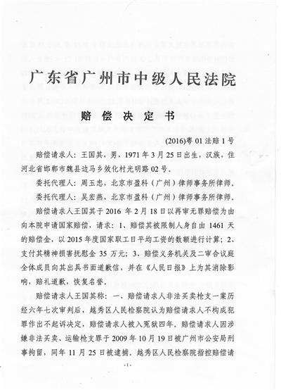 2013年,廣州中院啟動再審程序并作出判決,撤銷前面的終審裁定和越秀區(qū)法院一審判決中的量刑部分,但維持了一審法院定罪部分,以非法買賣、運輸槍支罪,改判王國其有期徒刑4年。由于低于法定刑期,判決需報請廣東高院與最高法核準(zhǔn)后生效。