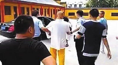 這是安徽蚌埠警方實(shí)施的一次抓捕行動(dòng)。被帶走時(shí),釋廣聞身著白色寬松上衣、黃色僧袍褲子,沒(méi)有任何反抗,表情平靜。