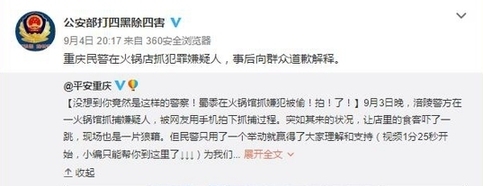 事后,有媒體了解到這名道歉者是來自重慶市涪陵區(qū)公安局荔枝派出所的一名民警。據(jù)他介紹,當(dāng)時是正在對一名長期吸販毒的犯罪嫌疑人實施抓捕。由于嫌疑人吸食毒品精神亢奮且隨身攜有刀具,抓捕過程比較激烈,不少店內(nèi)客人都起身圍觀,有些還拿出手機(jī)拍攝。抓捕結(jié)束后,帶隊民警第一時間找來餐館老板,亮明身份后表示警方會妥善處理餐館損失,并且特意向店內(nèi)顧客道歉,于是就有了視頻中顯示的畫面。