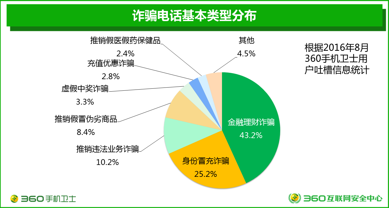 9月7日,360在京發(fā)布了國(guó)內(nèi)首份基于大數(shù)據(jù)研究的電信詐騙分析報(bào)告——《2016中國(guó)電信詐騙形勢(shì)分析報(bào)告》。報(bào)告中顯示,在用戶接到的所有詐騙電話中,虛假的金融理財(cái)詐騙最多,占43.2%,此類(lèi)詐騙在北上廣深等大城市尤其盛行。其次是身份冒充詐騙,占25.2%。各類(lèi)虛假的業(yè)務(wù)推銷(xiāo)電話也是被用戶大量吐槽的詐騙電話類(lèi)型。