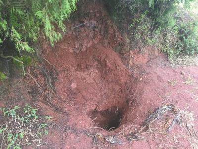 順著吳大爺?shù)闹敢?,記者穿過一片蘆葦?shù)?,整條山路雜草叢生,無路可尋。在山頂?shù)囊豢冒貥湎?,記者找到了尸體被埋處,一個(gè)約半米深、寬半米的泥坑,樹根裸露在外,周圍新翻的泥土掩蓋了雜草?,F(xiàn)場還有警方取證時(shí)留下使用過的一次性手套。