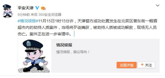 中新網(wǎng)11月15日電 據(jù)天津市公安局官方微博通報(bào),11月15日1時(shí)15分許,天津警方成功處置發(fā)生在北辰區(qū)普東街一煙酒超市內(nèi)的劫持人質(zhì)案件,當(dāng)場(chǎng)將歹徒擒獲,被劫持人質(zhì)被成功解救,現(xiàn)場(chǎng)無(wú)人員傷亡。