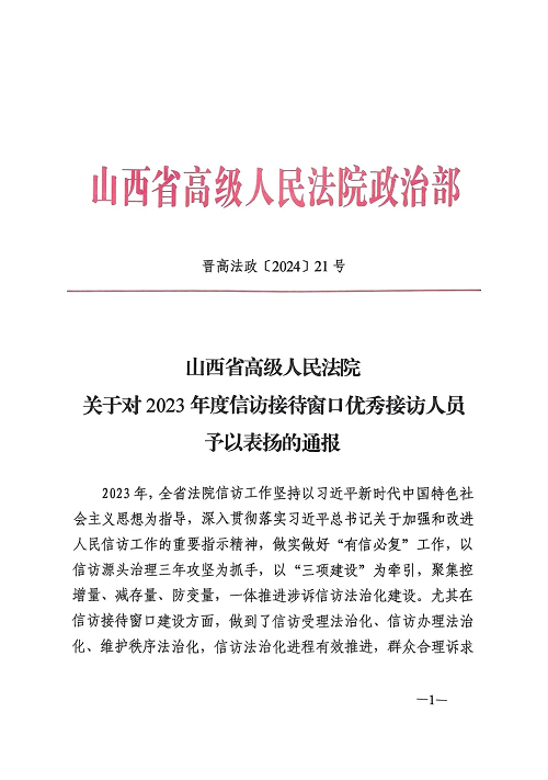 近日,山西省高級人民法院下發(fā)《關(guān)于對2023年度信訪接待窗口優(yōu)秀接訪人員予以表揚的通報》,忻州法院2名干警榜上有名。忻州中院黨組書記、院長栗向東作出批示,要求全市法院干警以受到表揚的同志為榜樣,愛崗敬業(yè),爭當(dāng)先進,爭創(chuàng)一流工作業(yè)績。