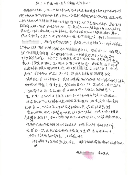 10月9日,忻州市公安局反詐中心收到了受害人親筆寫下的感謝信,信中表達(dá)了對(duì)忻州反詐民警真誠(chéng)而濃厚的謝意。