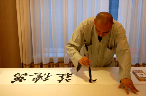 7月5日下午,筆者在五臺(tái)山金都山莊偶遇精彩一幕。只見數(shù)十人屏氣凝神,圍觀一行腳僧現(xiàn)場(chǎng)揮毫潑墨。行云流水之際,一幅幅書法作品躍然紙上。