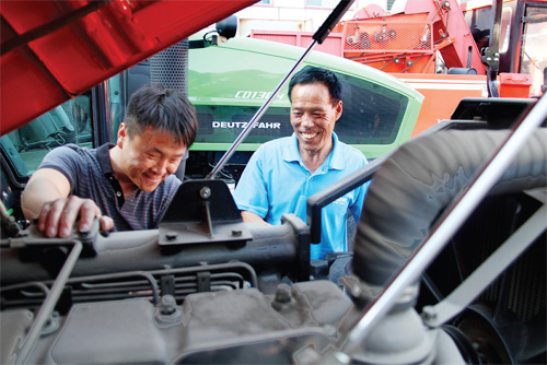 7 月13 日,兩位農(nóng)民在原平市農(nóng)機公司選購?fù)侠瓩C。近年來,原平市落實各項惠農(nóng)政策,極大地調(diào)動了農(nóng)民購買和使用農(nóng)機具的積極性,在小麥?zhǔn)崭罱咏猜曋H,農(nóng)民抓緊時間選購?fù)侠瓩C等國家補貼農(nóng)機具,為在麥田地里進行夏播做準(zhǔn)備。(褚震 攝)