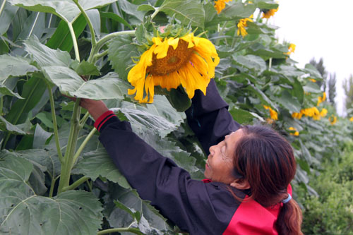 7月20日,原平市解放街農(nóng)民劉麗平正在長勢喜人葵花地里打支扣進行管理。該市積極引導農(nóng)民大力發(fā)展油料經(jīng)濟農(nóng)業(yè)種植,因地制宜、多措并舉,促使農(nóng)業(yè)增產(chǎn)農(nóng)民增收。(趙春曉 攝)