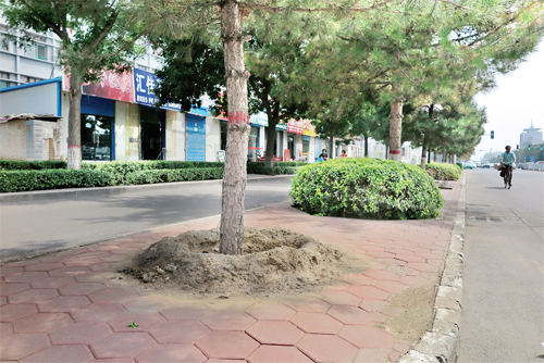 近日,記者途經(jīng)城區(qū)長(zhǎng)征西街建設(shè)路口時(shí),發(fā)現(xiàn)在道路北側(cè)的綠化帶內(nèi),有的行道樹(shù)樹(shù)坑只是用土堆進(jìn)行了簡(jiǎn)單的堆砌,時(shí)值秋雨多發(fā)時(shí)期,在雨天極易造成一定程度的水土流失。希望市政管理部門能夠引起重視,早日為樹(shù)坑穿上一件“金鐘罩”。(王君 攝)