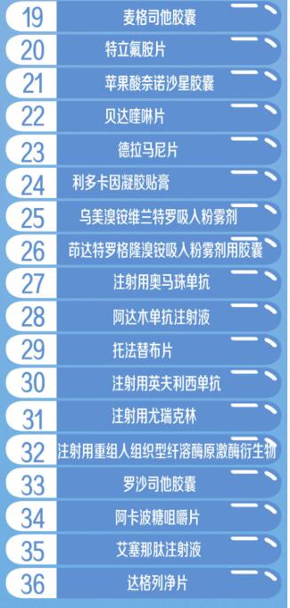 此外,肺癌、直腸癌、乳腺癌等有了更多靶向和化療藥選擇,波生坦、麥格司他等藥品的談判成功,使肺動(dòng)脈高壓、C型尼曼匹克病等罕見病患者擺脫目錄內(nèi)無藥可治的困境,糖尿病、乙肝、類風(fēng)濕性關(guān)節(jié)炎、耐多藥結(jié)核、慢性阻塞性肺炎等患者也有了更多優(yōu)質(zhì)新藥可供選擇。