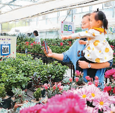 江蘇南通市民在五里樹花卉基地掃碼購買鮮花,體驗(yàn)不接觸購物帶來的便捷。王俊榮攝(人民視覺)