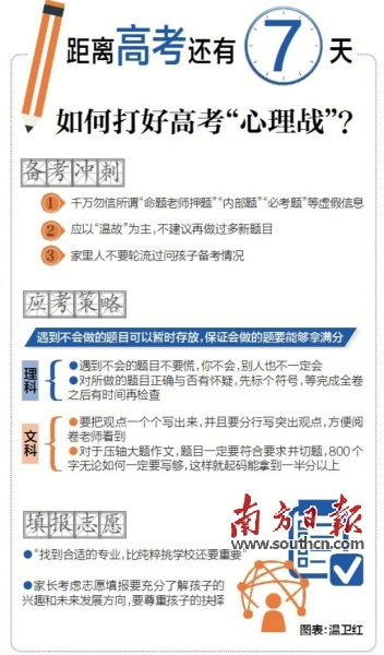 張敏強不忘囑咐家長,要創(chuàng)造寬松、良好的環(huán)境,讓考生輕松上陣?!耙欢ㄒ尯⒆有菹⒑?,補品不要吃太多,家里其他的人,不要每個人都過問?!彼€提醒,所有的高考用具,要備份一套。