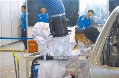 圖為世界技能大賽全國(guó)選拔賽汽車(chē)修理項(xiàng)目的比賽現(xiàn)場(chǎng),一名參賽選手正在檢查車(chē)身。