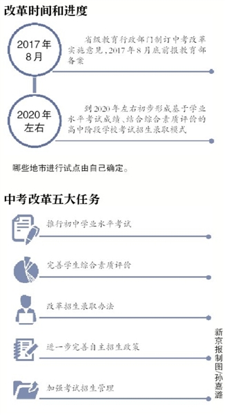 根據(jù)安排,省級教育行政部門負責(zé)制訂中考改革實施意見,并于2017年8月底前報教育部備案。同時,綜合改革試點將從2017年之后入學(xué)的初中一年級學(xué)生開始實施,目前初中在校生、非試點地市仍執(zhí)行原來的考試招生辦法。