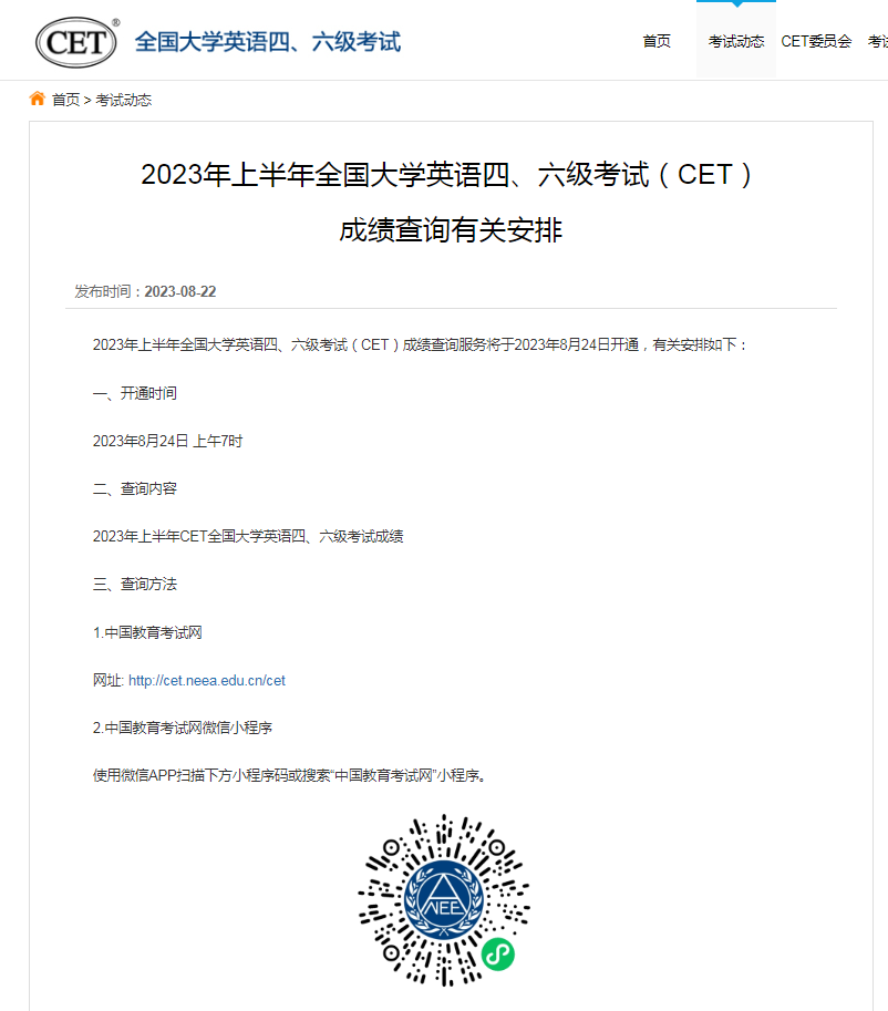 8月22日,中國(guó)教育考試網(wǎng)發(fā)布消息,2023年上半年全國(guó)大學(xué)英語(yǔ)四、六級(jí)考試(CET)成績(jī)查詢服務(wù)將于2023年8月24日上午7時(shí)開(kāi)通。