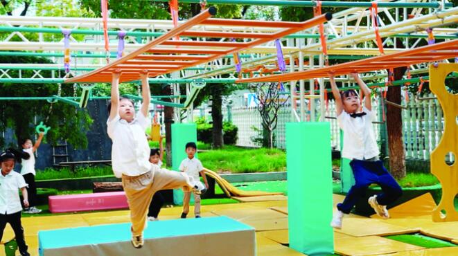 常州市五星幼兒園的負責(zé)人王艷表示,有一次同事將幾條外國幼兒園、小學(xué)低年級年齡段孩子進行體能訓(xùn)練的視頻發(fā)了過來,視頻上的孩子能夠完成跳鞍馬、手倒立行走等動作?!坝谑牵覀兘Y(jié)合孩子們的意見,邀請專家共同繪制賽道構(gòu)思圖,將平衡、走、跑、跳、攀爬、懸掛等動作元素融為一體,打造出一個綜合性的體能游戲賽道。”